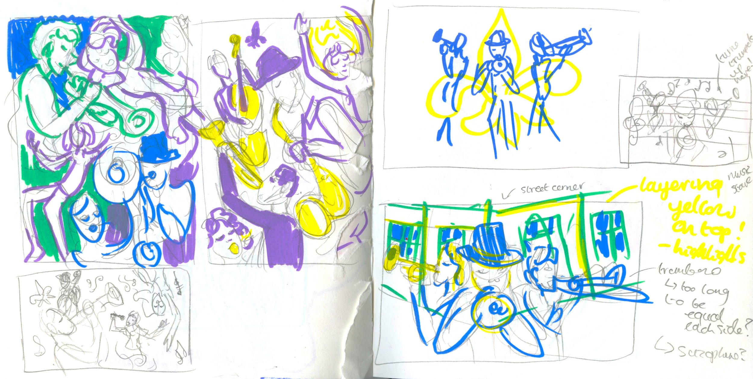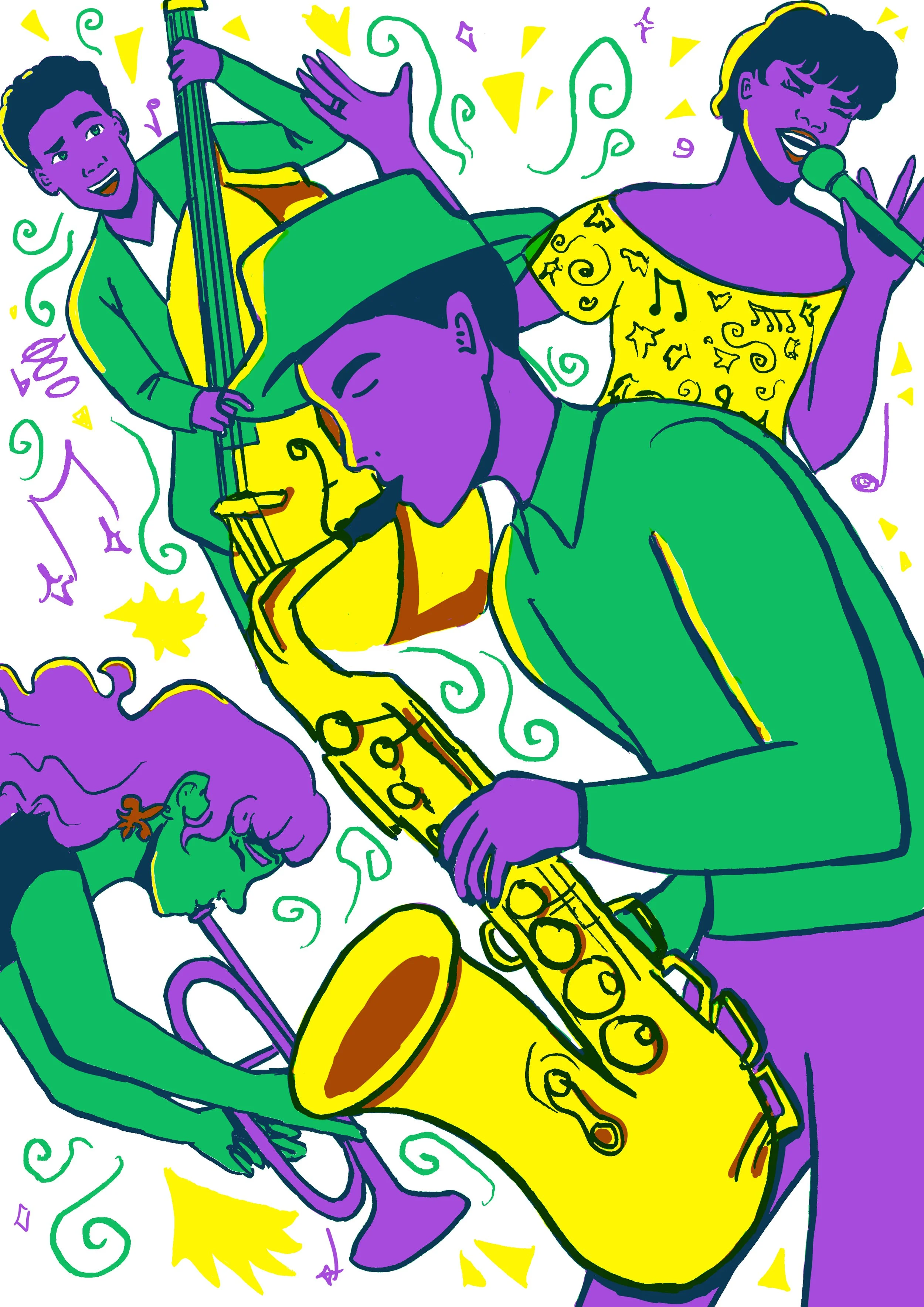 I was set a brief to create a print depicting an aspect of New Orleans, so I decided to focus on the vibrant music culture, exploring their history of buskers, jazz musicians and famous artists such as Irma Thomas. I finalised my design in Photoshop before screen-printing my illustration.